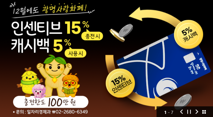 11월에 이어 12월에도 광명시민이라면 광명사랑화폐를 충전하고 쓰는 것만으로도 큰 혜택을 누릴 수 있는 기회입니다. 연말 소비 계획이 있다면 15% 인센티브와 5% 캐시백 혜택을 적극적으로 활용하시기 바랍니다.