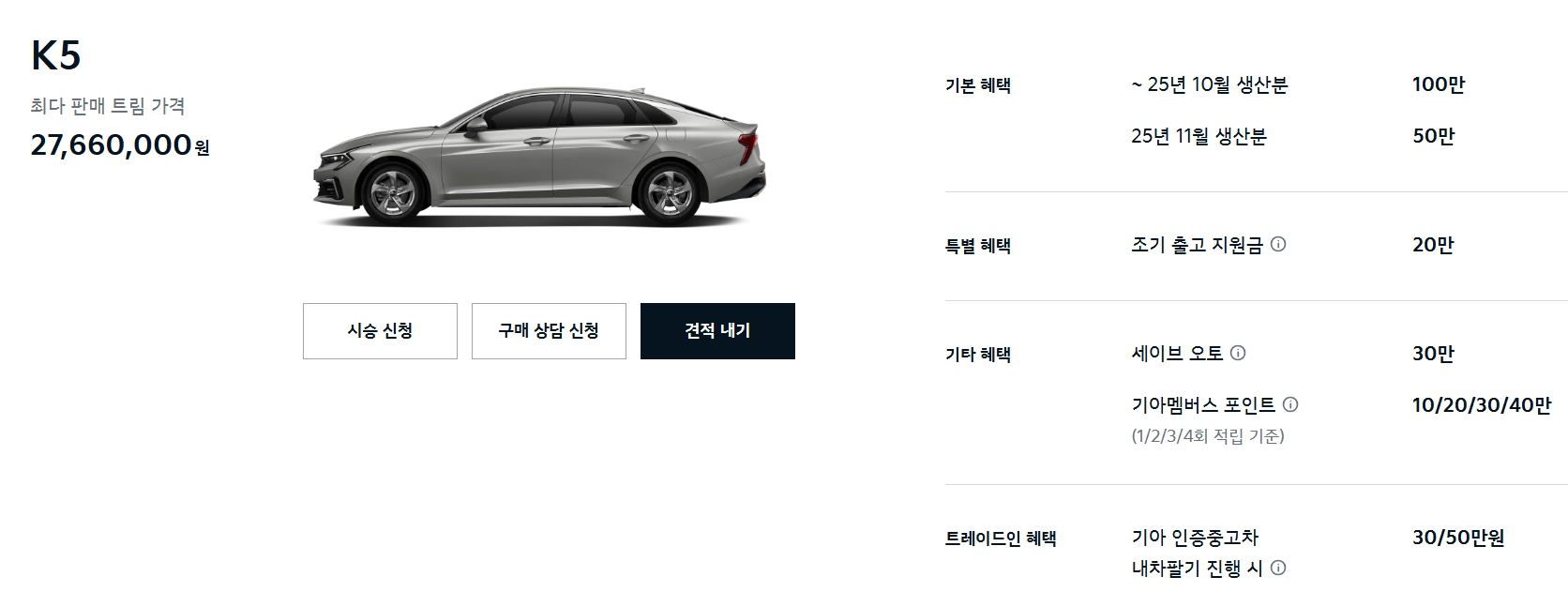 이번 K5 프로모션은 기본 지원금, 금융 프로그램, 멤버스 포인트, 그리고 트레이드인까지 다방면에서 혜택을 제공하며, 각 항목별 중복 적용 시 최대 240만 원까지 할인이 가능합니다.