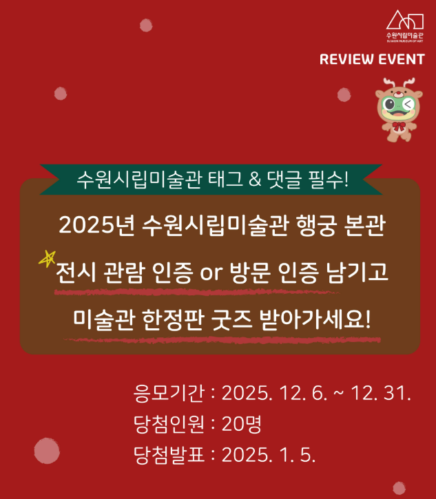 12월 31일까지 진행되는 이번 이벤트에 많이 참여하시고, 소중한 추억과 함께 수원시립미술관 한정판 굿즈라는 특별한 선물도 꼭 받아가시길 바랍니다!