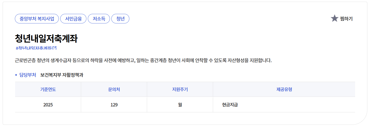 - 목적: 일하는 저소득 청년의 자산 형성 지원을 위한 정부 지원 저축 제도.