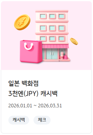 | 일본 JCB 특별 캐시백 | 일본 오프라인 가맹점 | 10,000엔 (약 9~10만원) | ~ 4/30 |