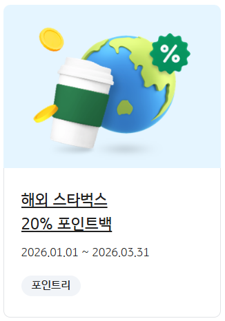 | 해외 스타벅스 포인트백 | 전 세계 스타벅스 매장 | 매월 1만P (최대 3만P) | ~ 3/31 |