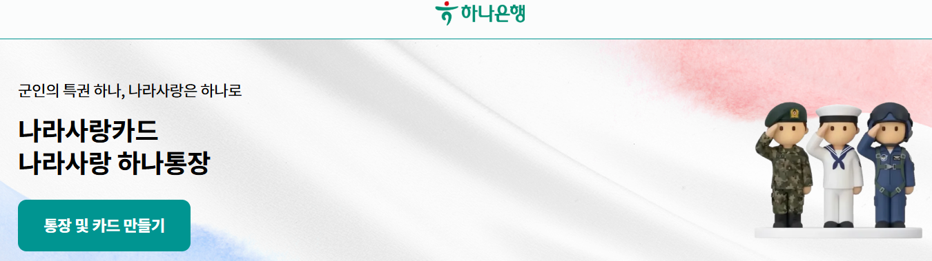 하나 나라사랑카드는 1월 초부터 발급이 가능하니, 입대 예정자라면 하나은행 계좌를 미리 준비해 두시는 것도 좋은 전략입니다.